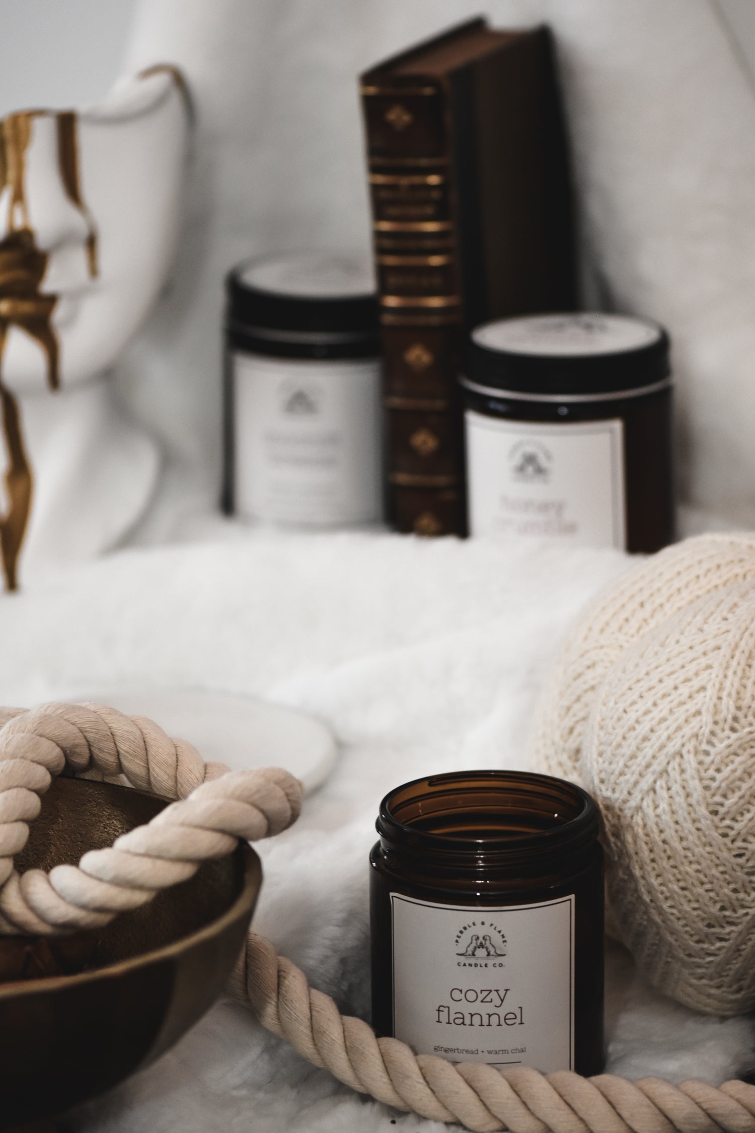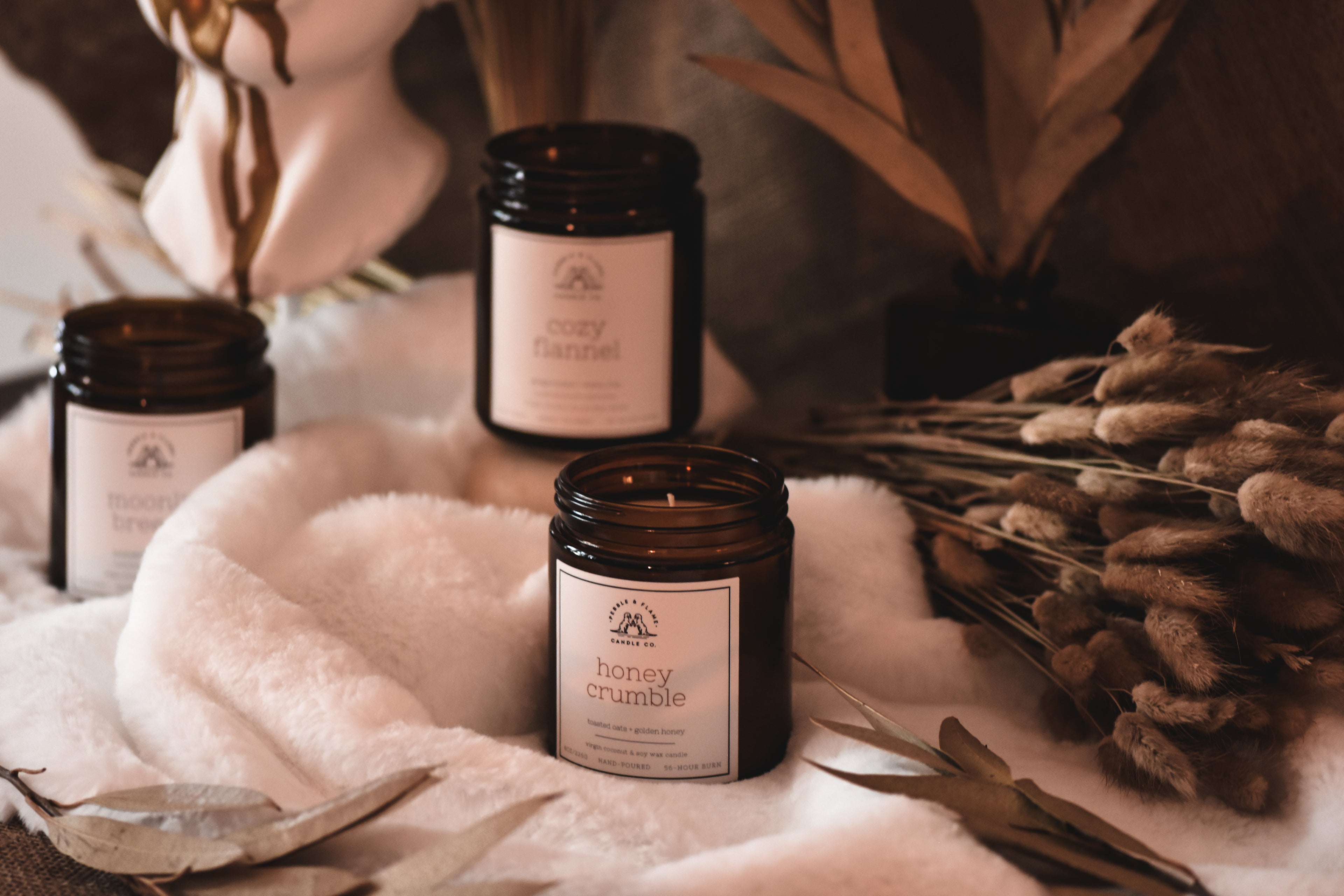 at pebble & flame, we hand-pour each candle in small batches using 100% virgin coconut and soy wax to guarantee a clean burn and a longer lifespan.